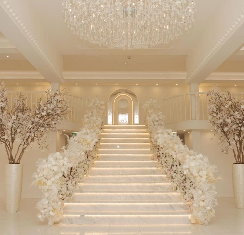 Inbegrepen: Verlichting, Plafond bloemen in bijna elk gewenste kleur, Gordijnen, Vierkante bloemenpoort in gewenste kleur.