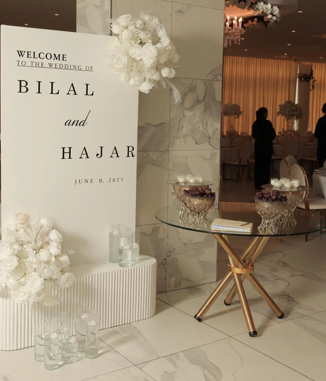 Inbegrepen: Bridal room bord met backdrop design, pilaren, Paspop, Bloemstuk.
