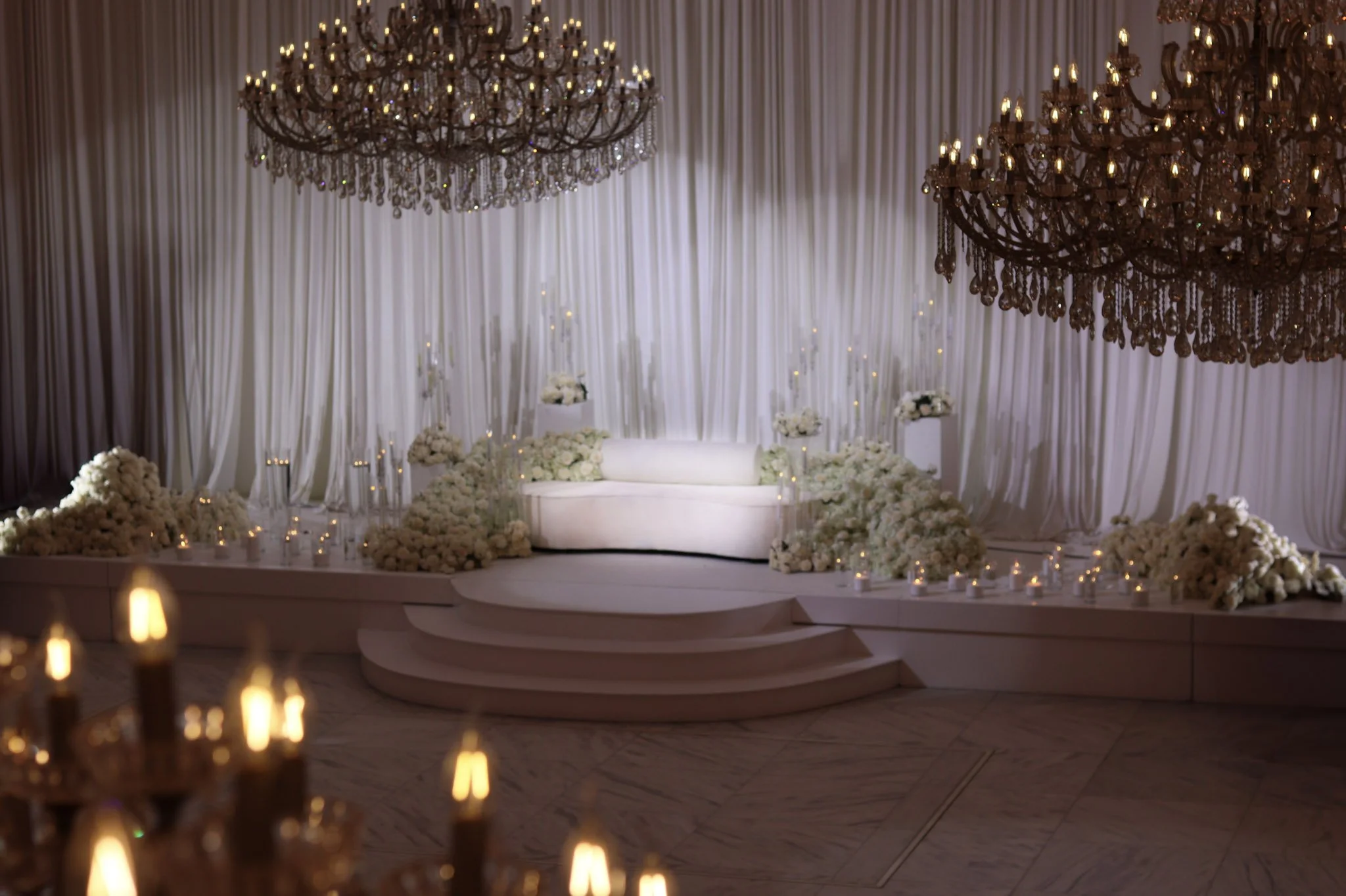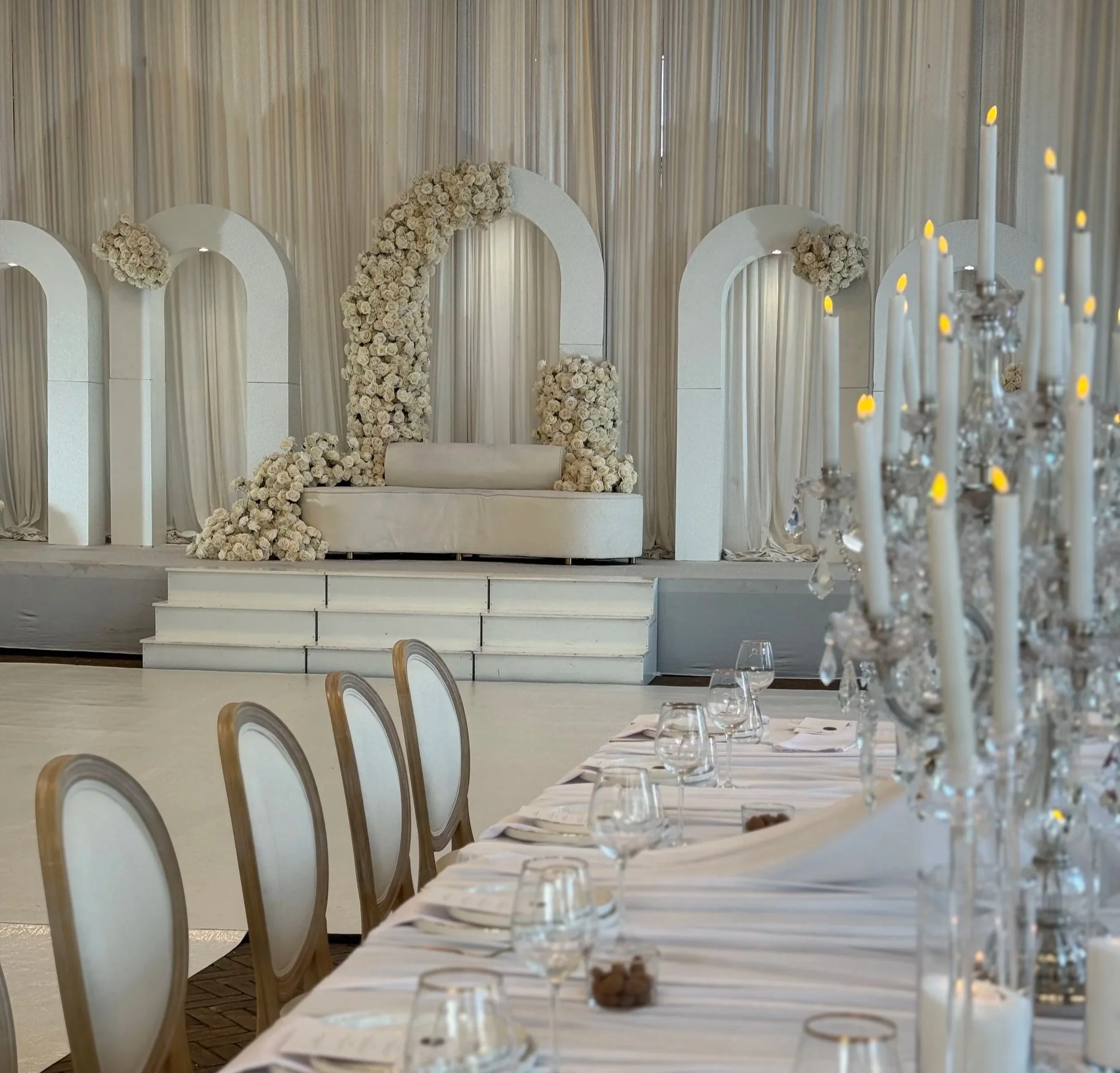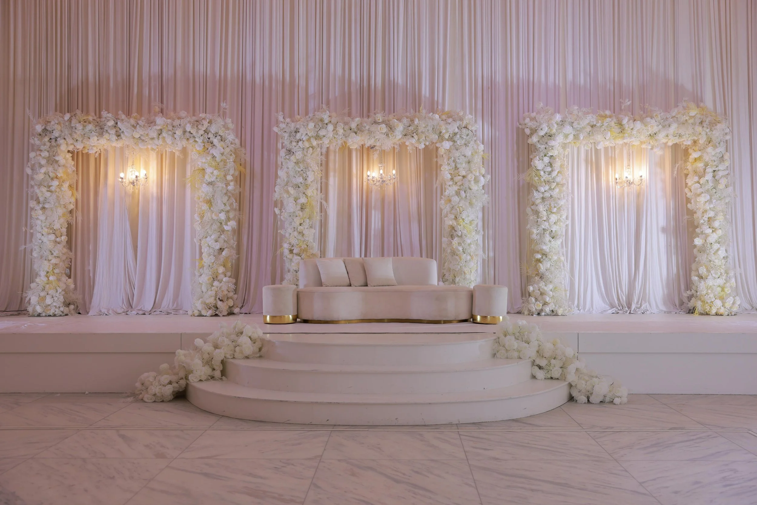 Here you will find our various design stages. All our designs are created by our designers themselves to achieve a beautiful end result. These stages all come with a bridal bench, white flooring, lighting, and necessary accessories (excluding podium and podium stairs).